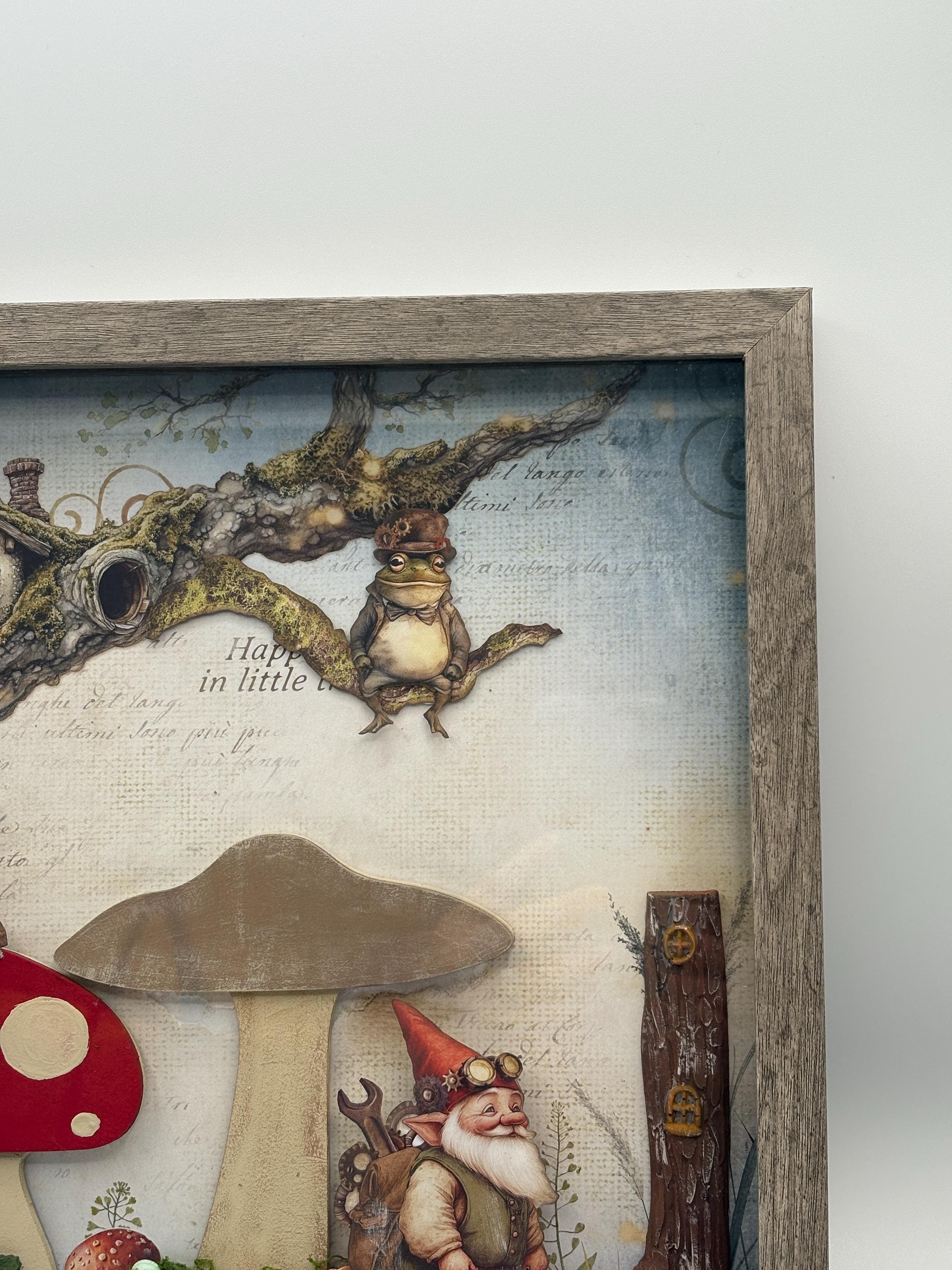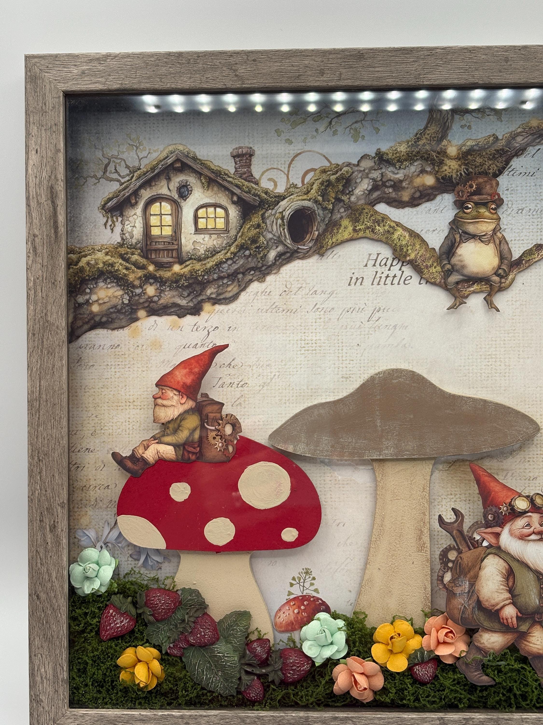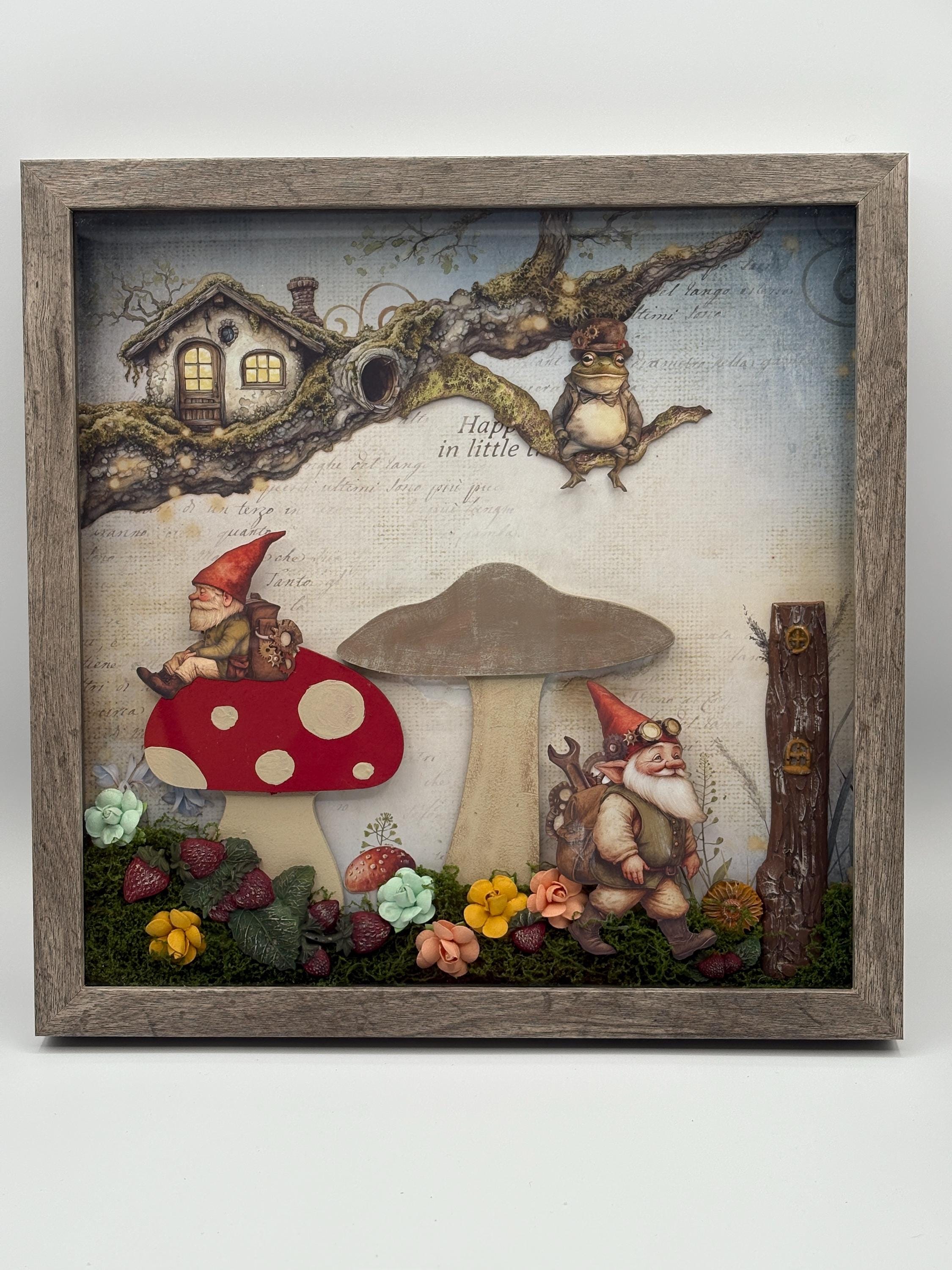 Scene is of the forrest with mushrooms, gnomes, frog and tree house. Field of strawberries and flowers.