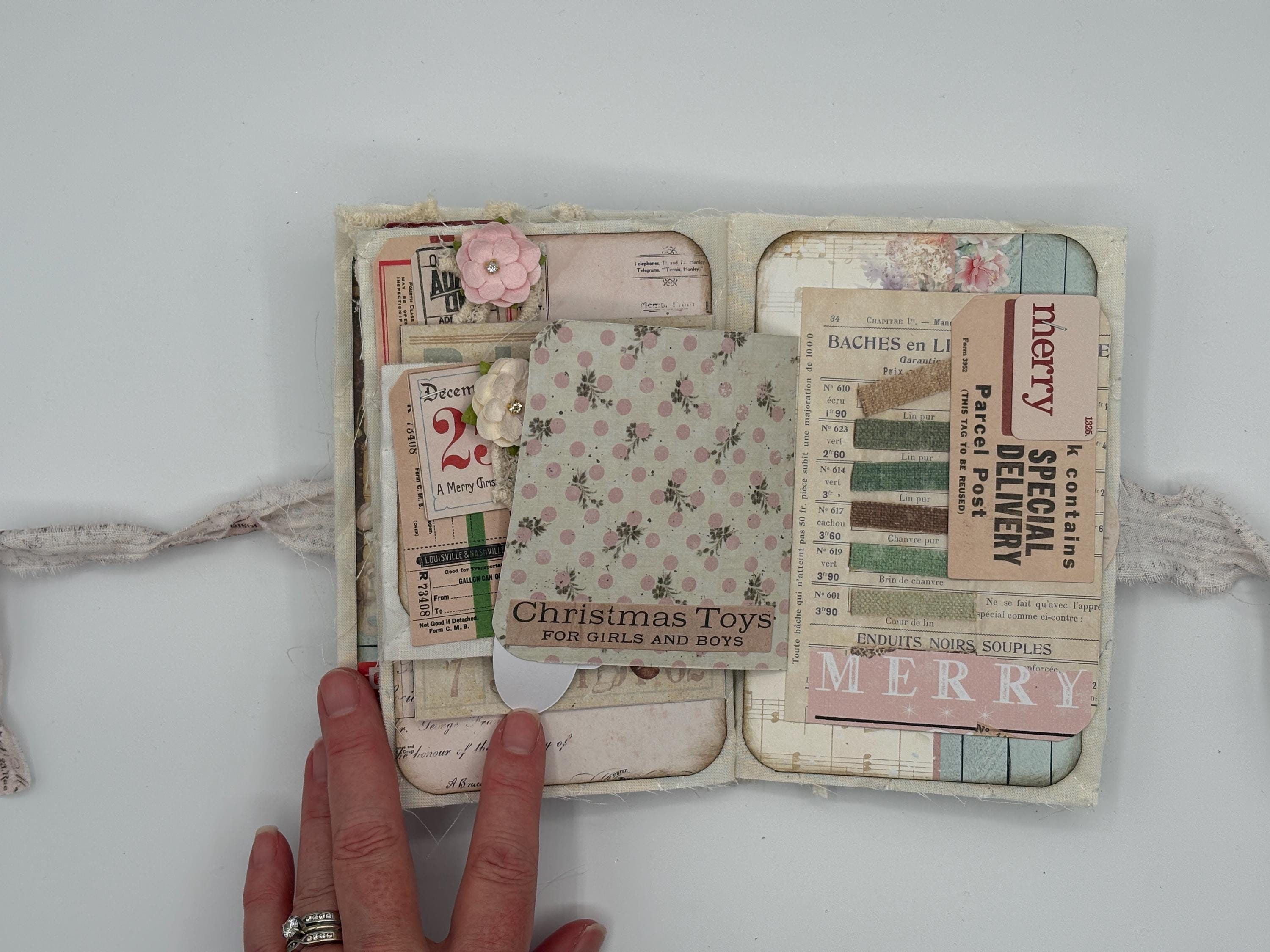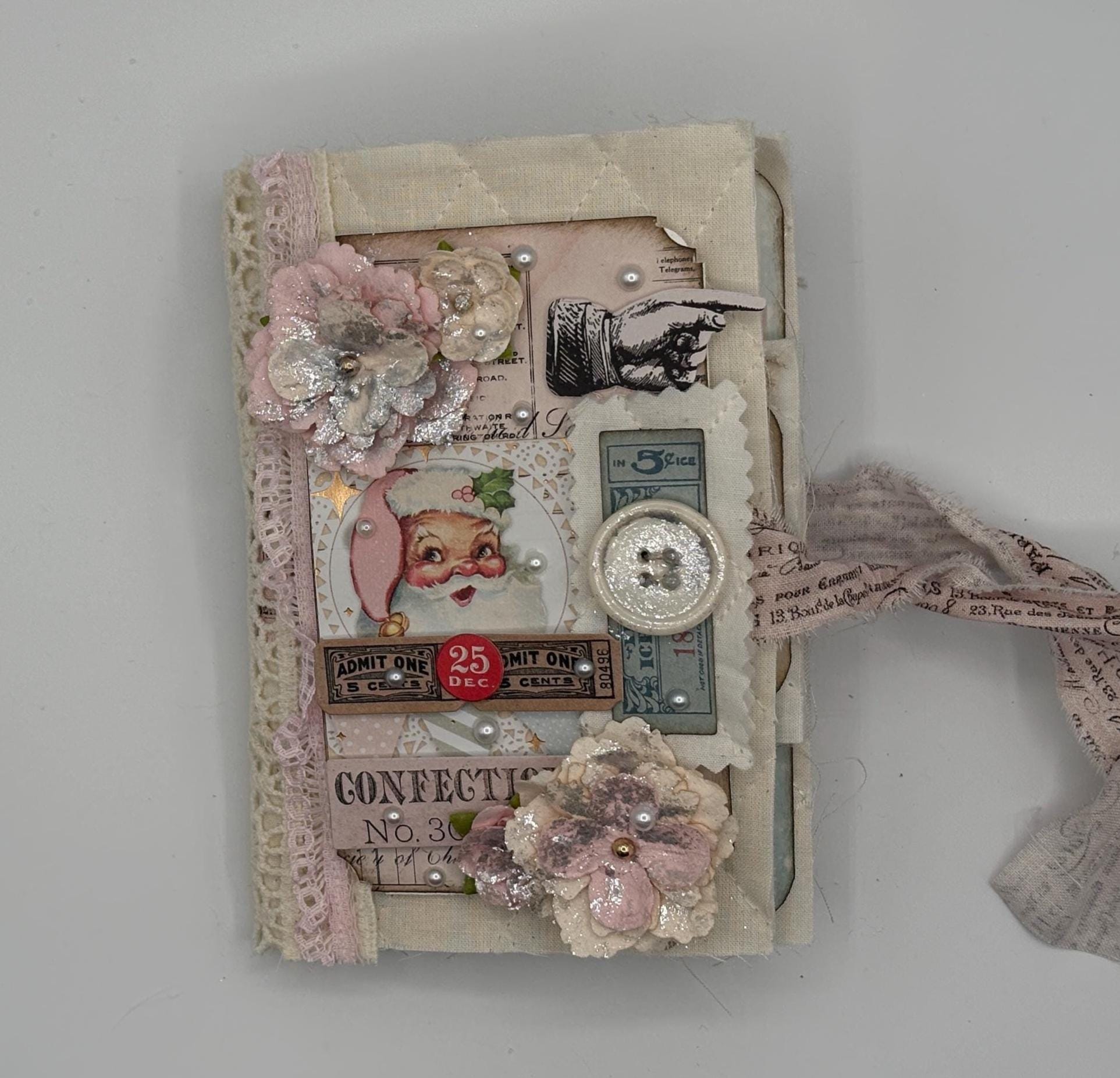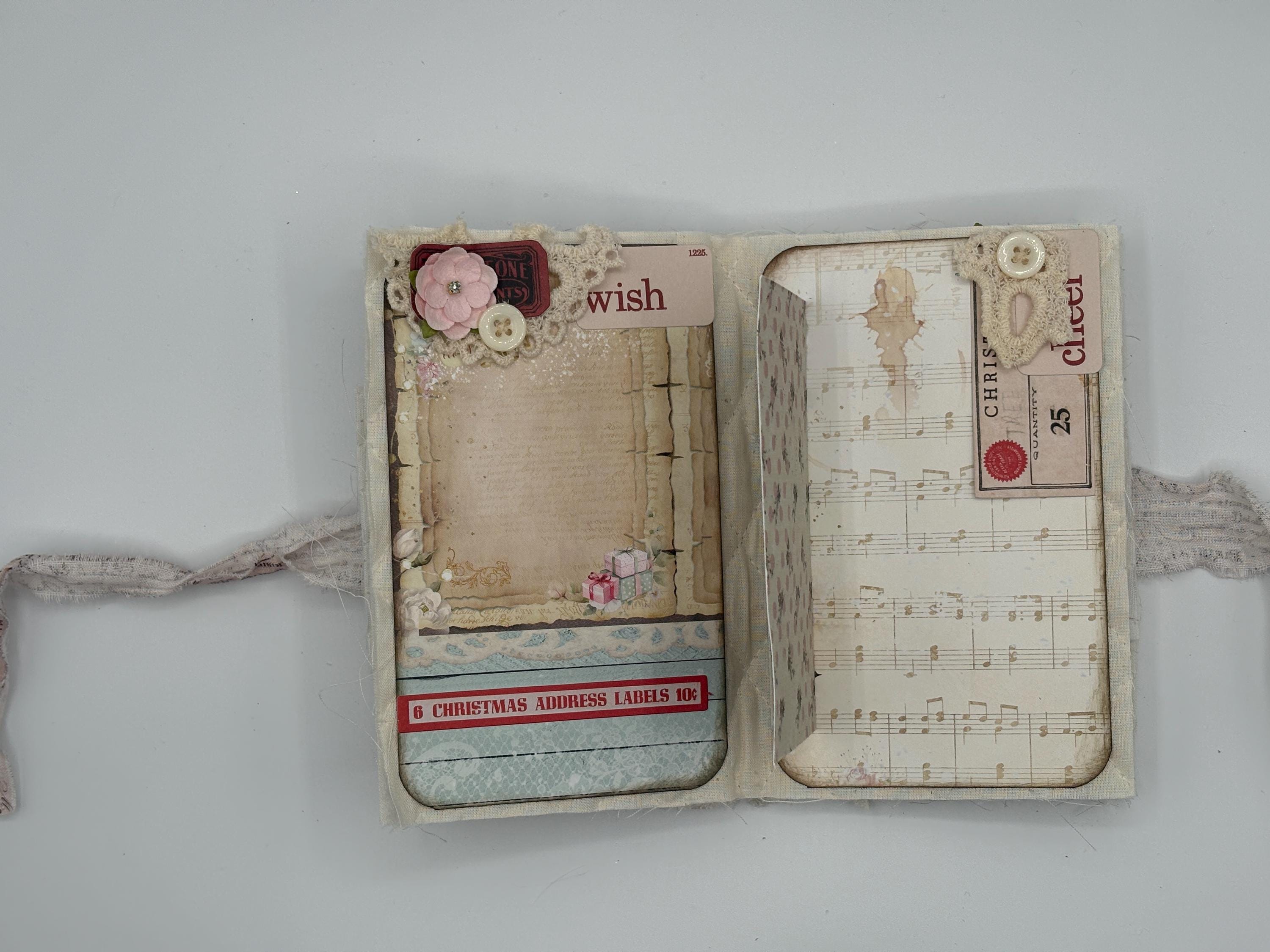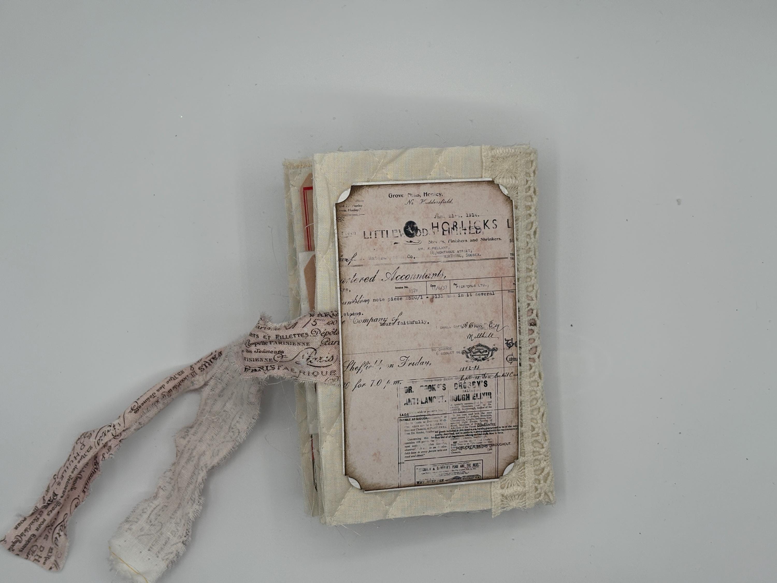 Decorated with lace, buttons, ephemera, flowers, pearls, glitter