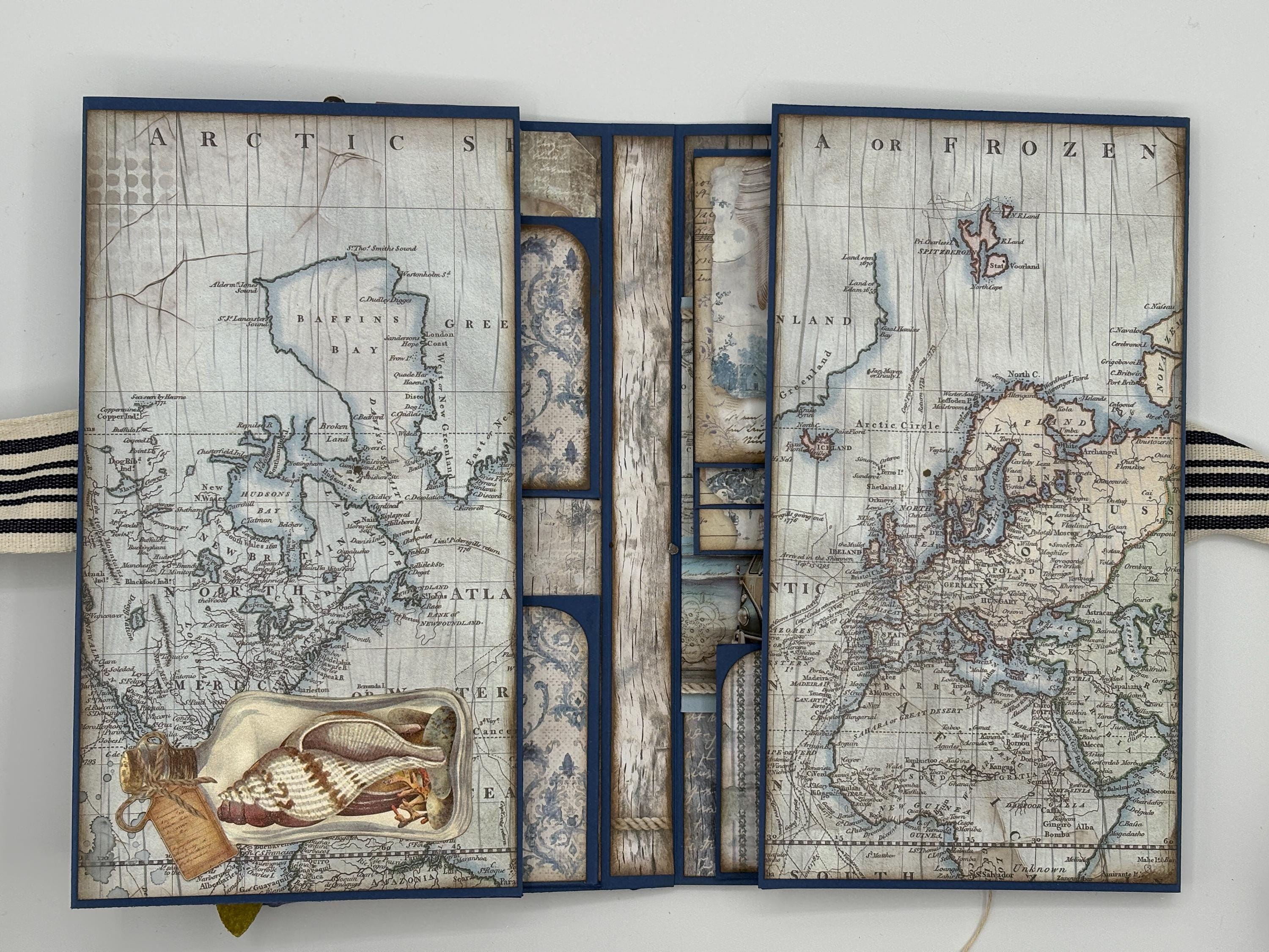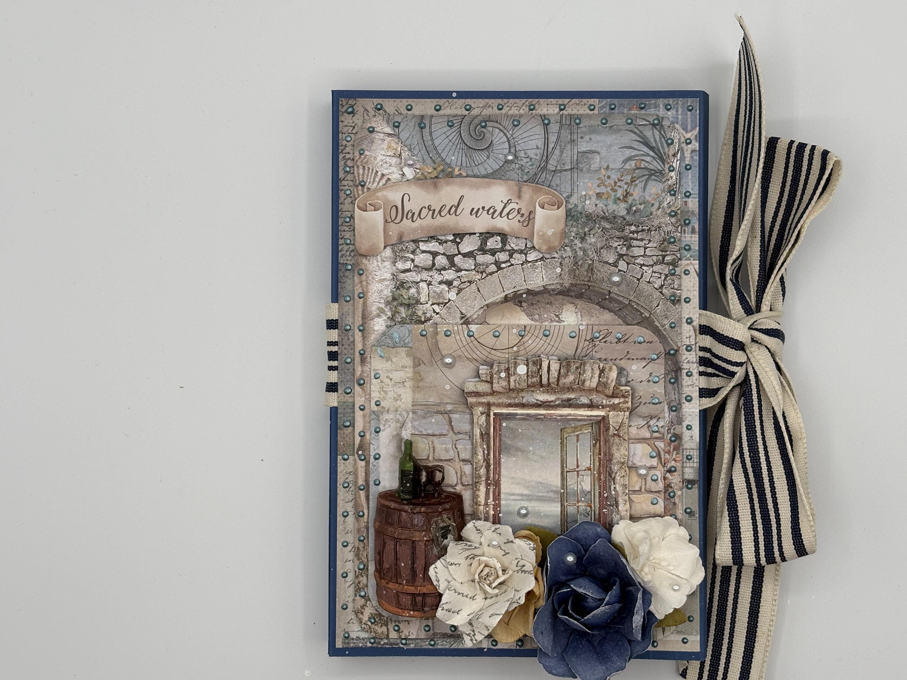 Decorated with pattern paper, ephemera, flowers, distress inks, glitter spray, liquid pearls, and ribbon