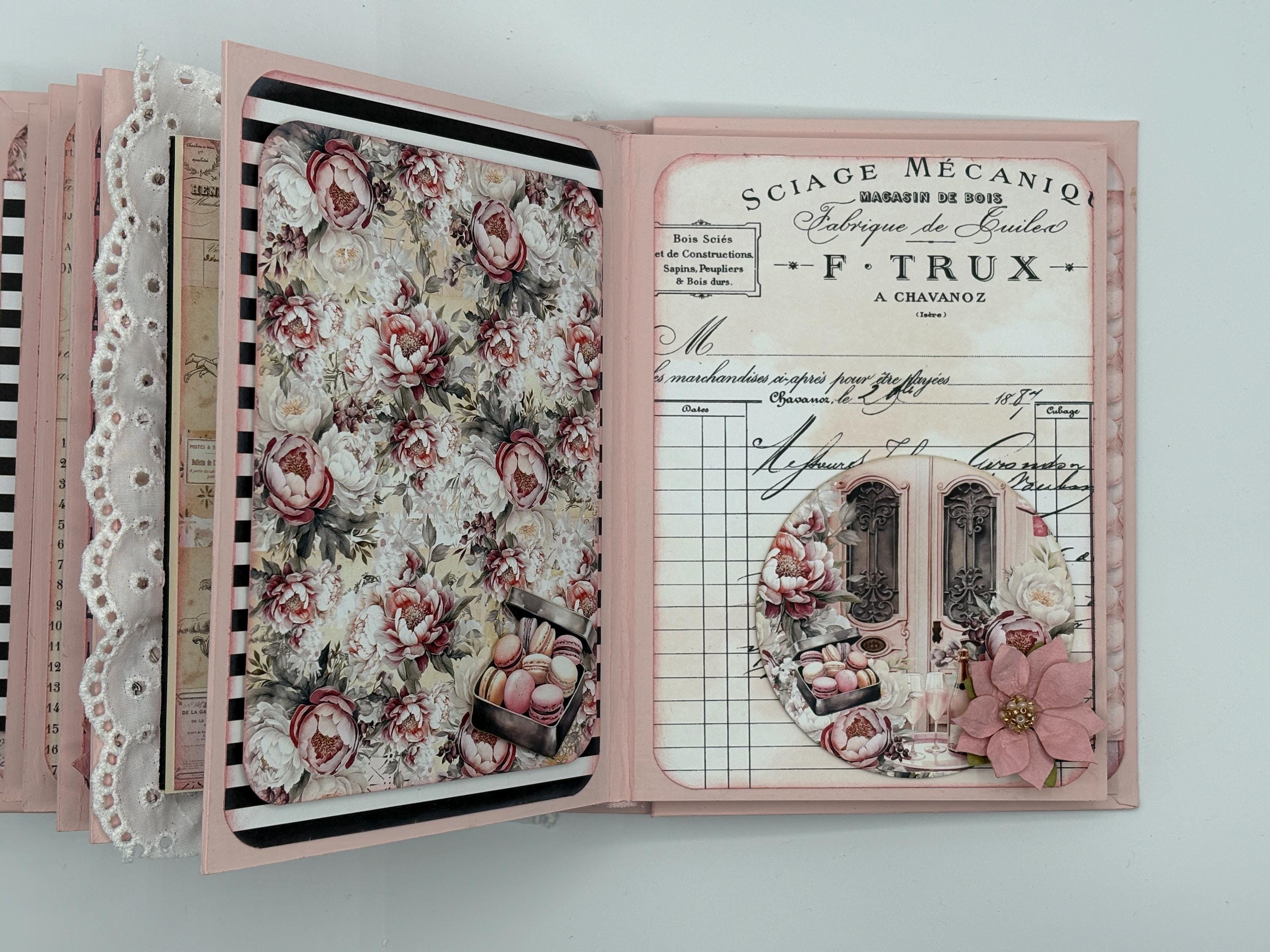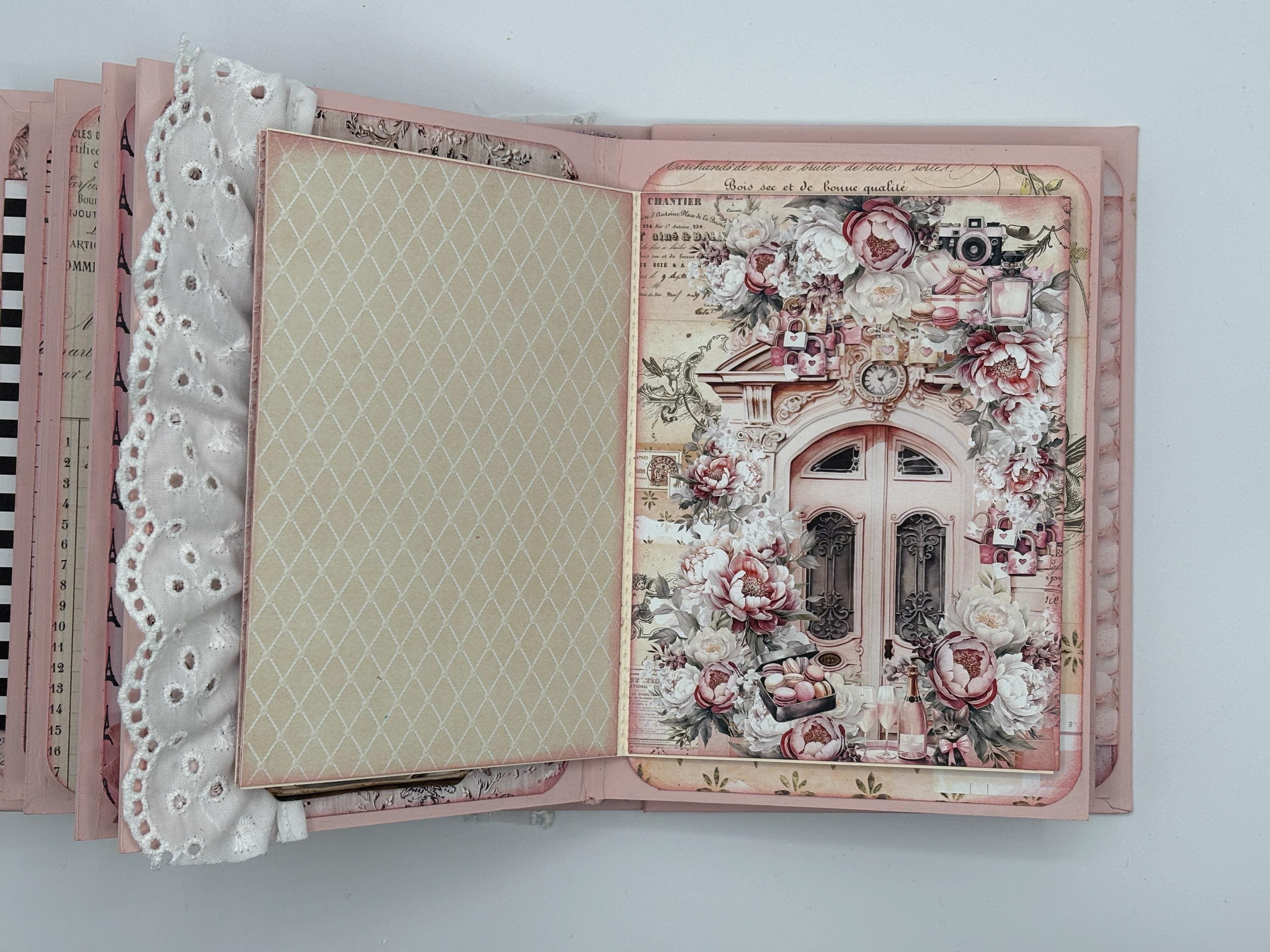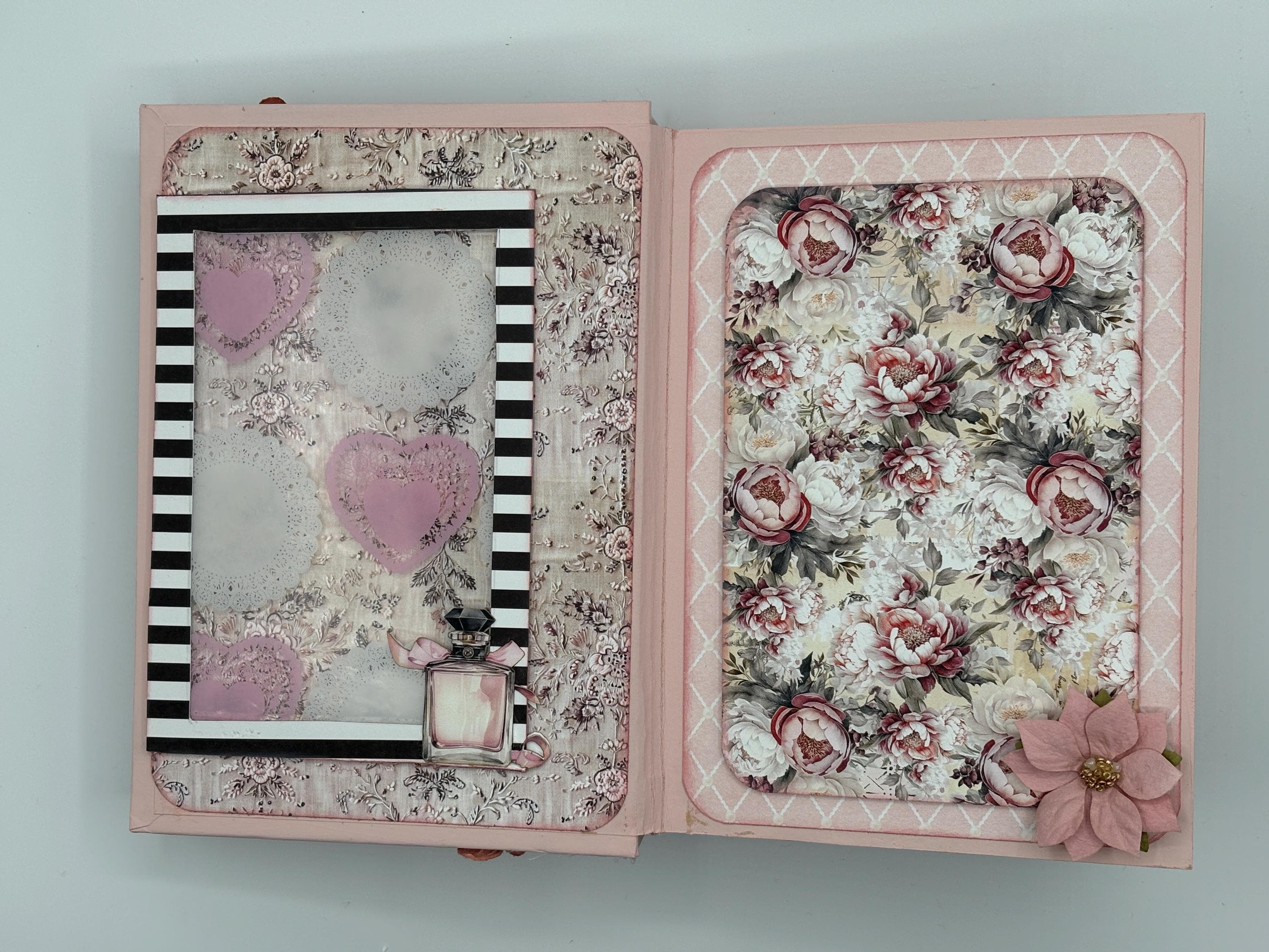 Decorated with pattern paper, paint, ephemera, lace, fabric, flowers, resin frame, distress ink, acetate
