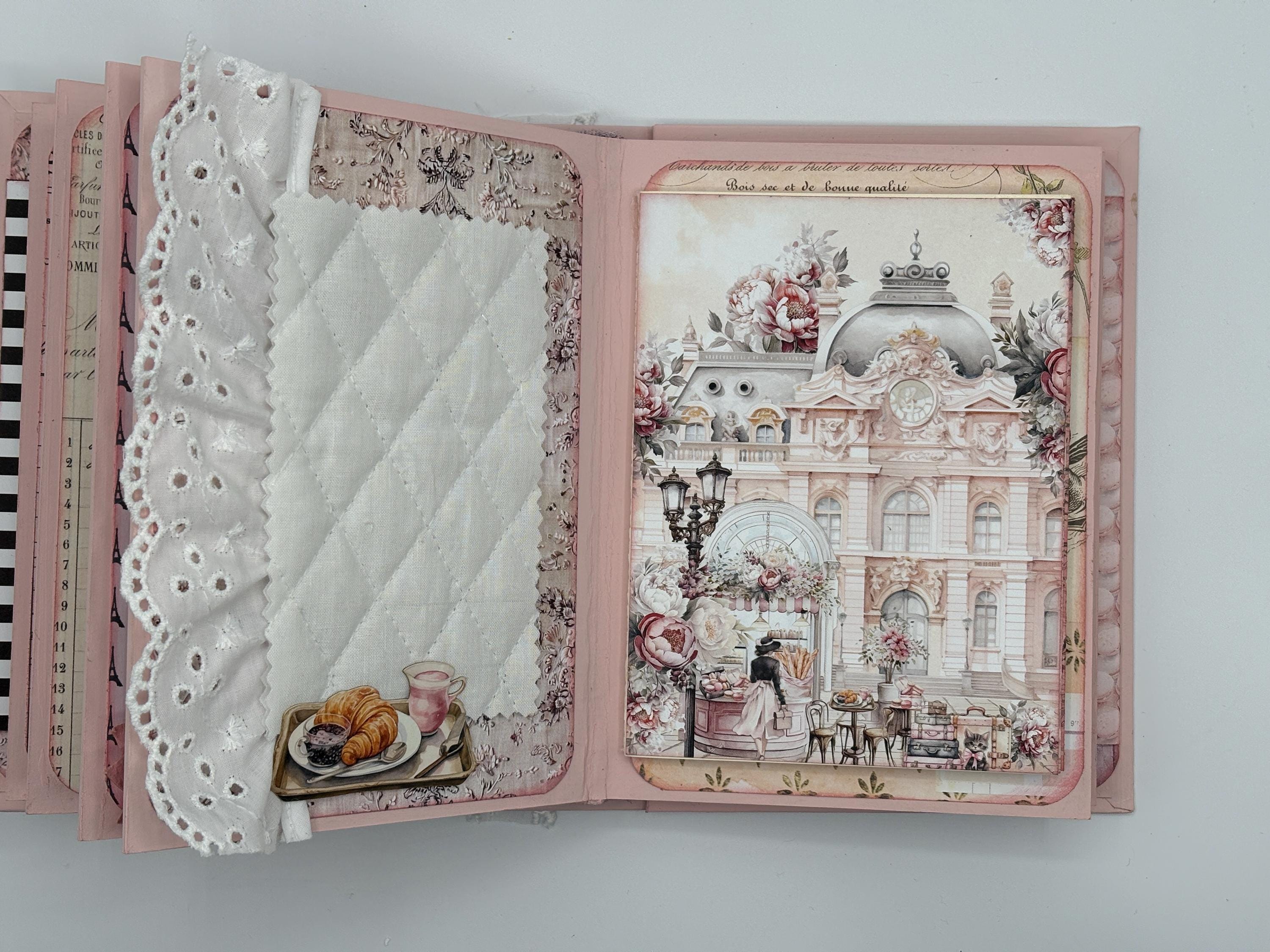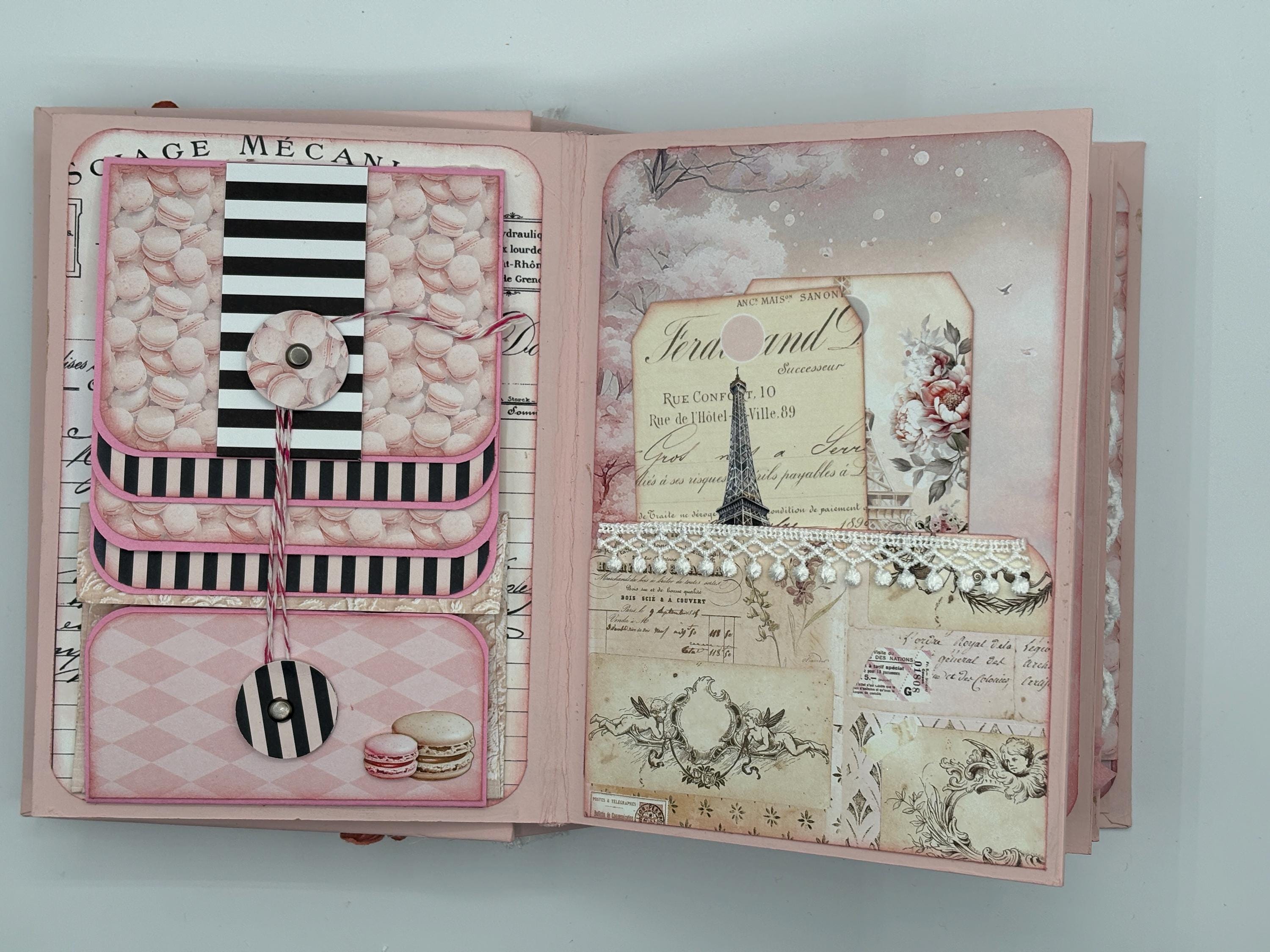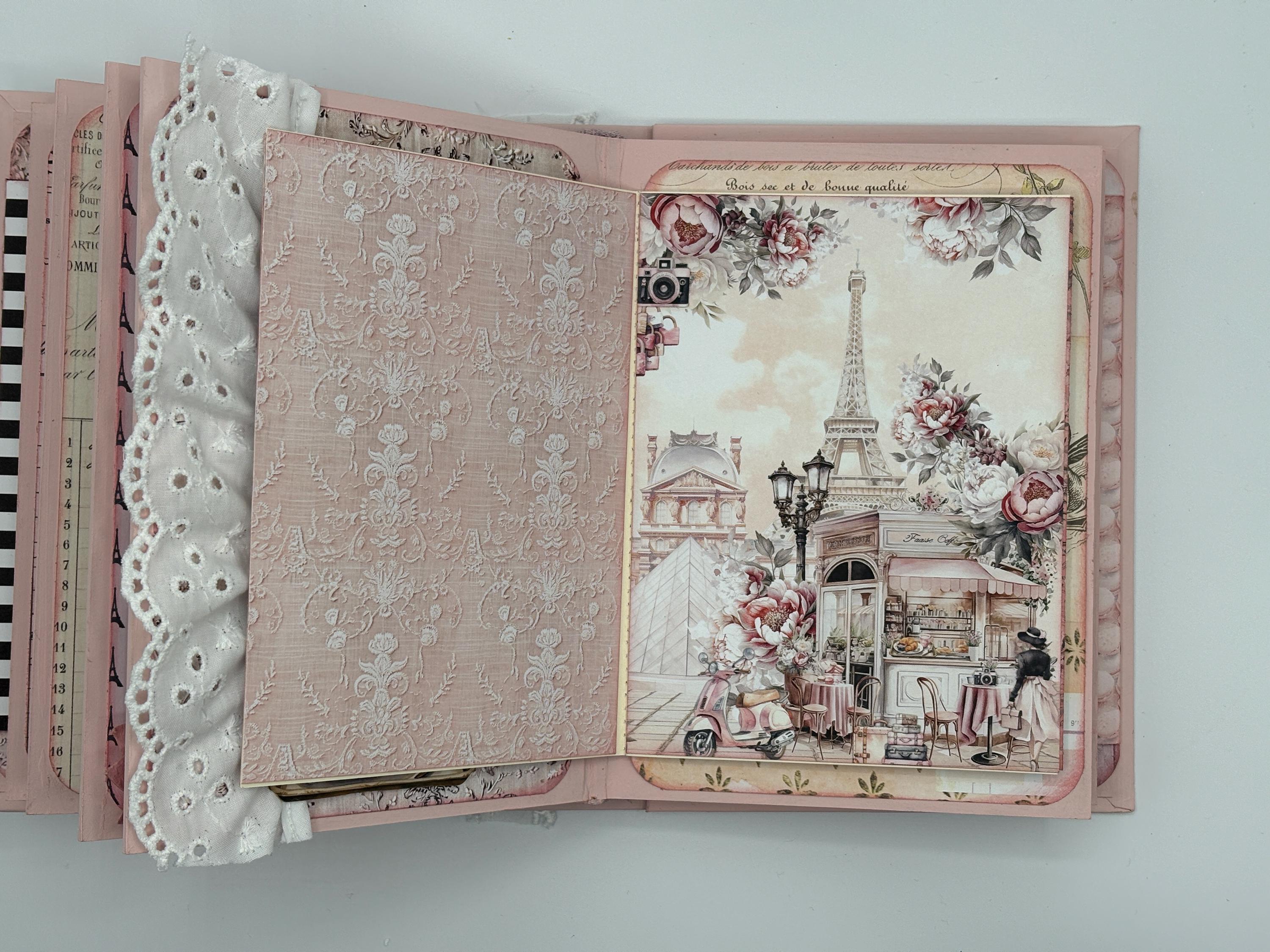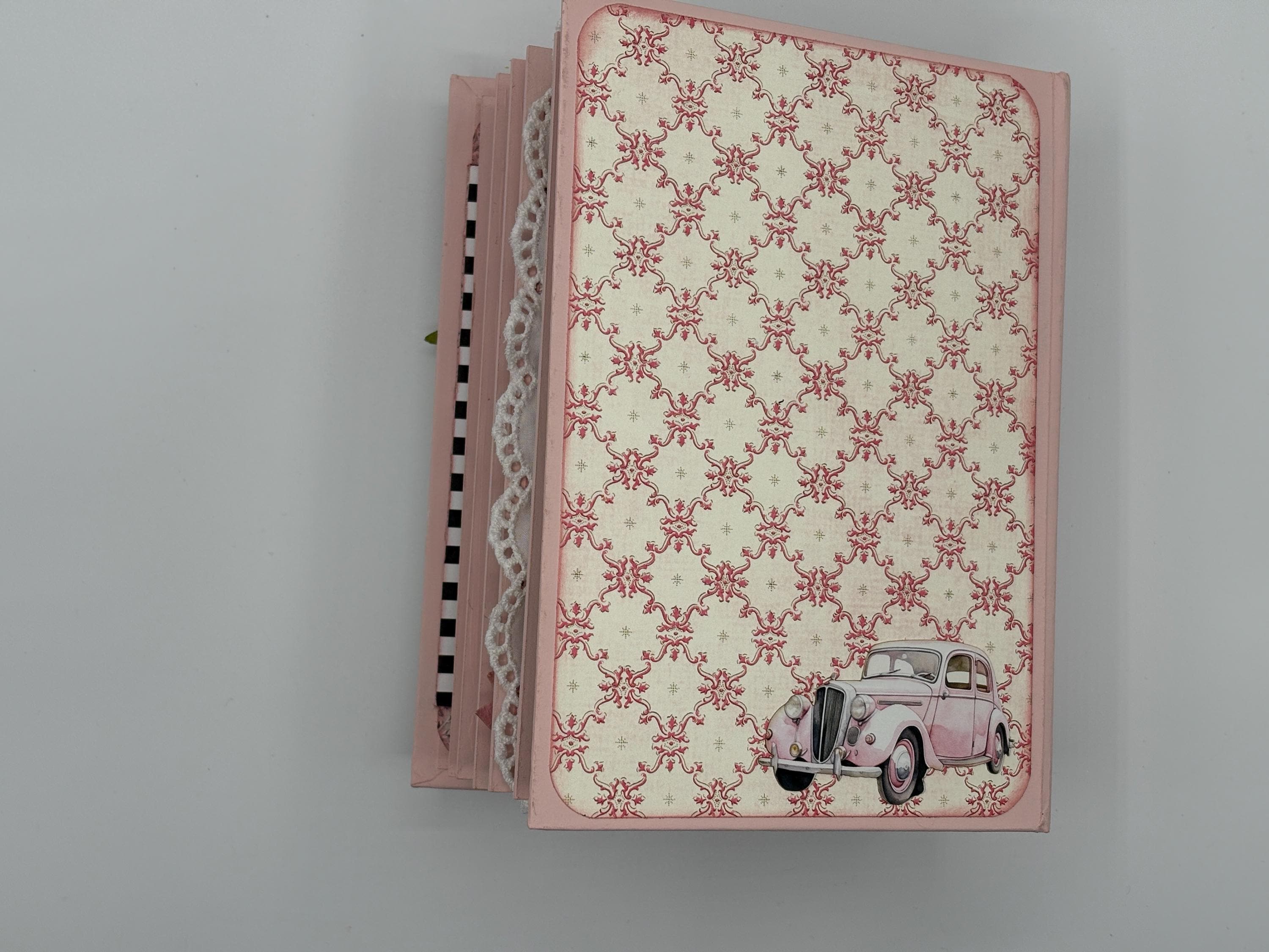 Decorated with pattern paper, paint, ephemera, lace, fabric, flowers, resin frame, distress ink, acetate