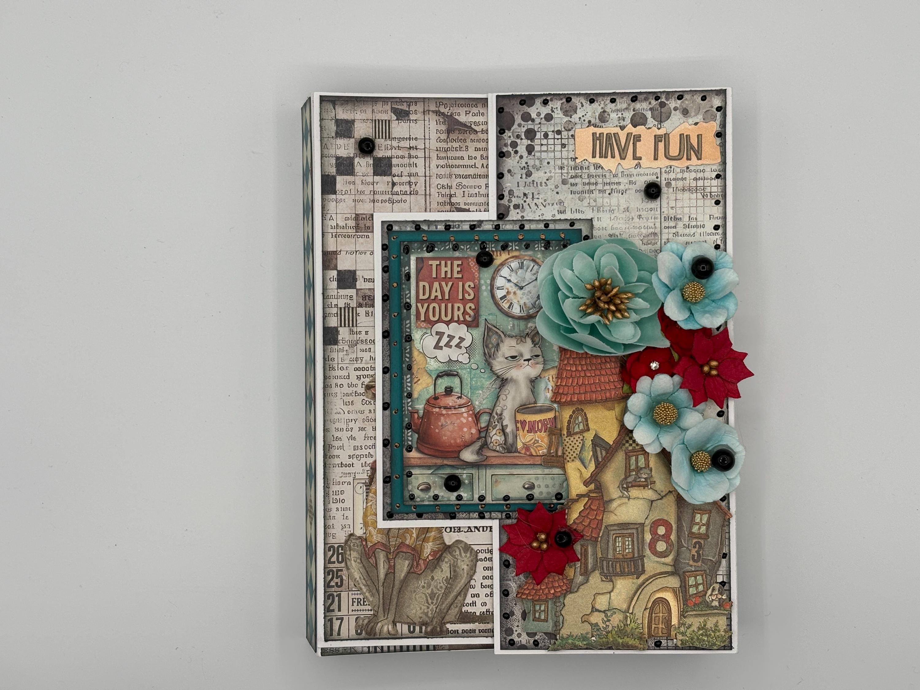 Decorated with pattern paper, distress inks, ephemera, flowers, pearls, and liquid pearls