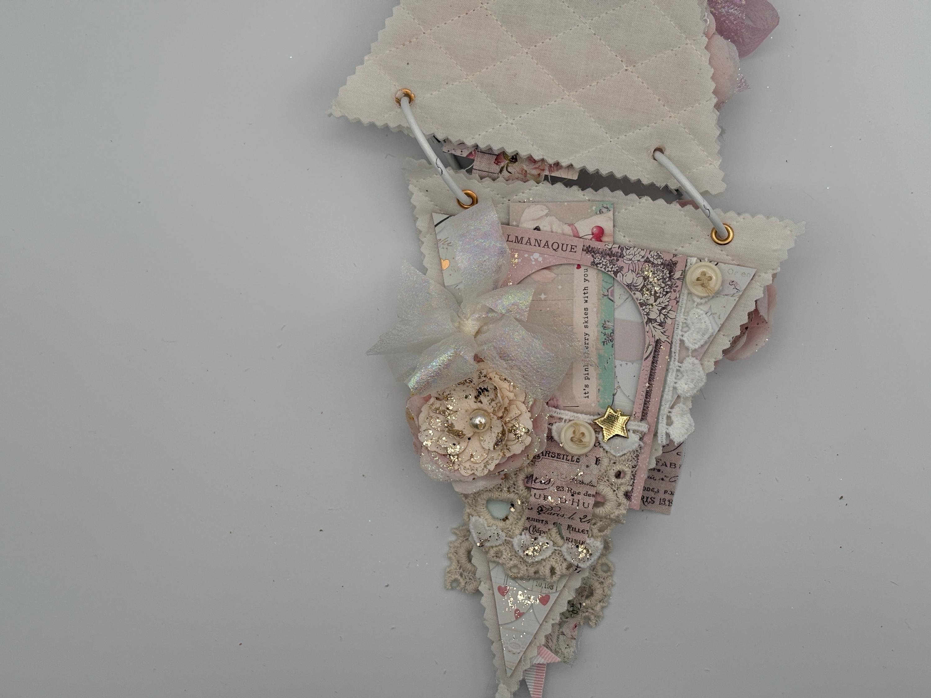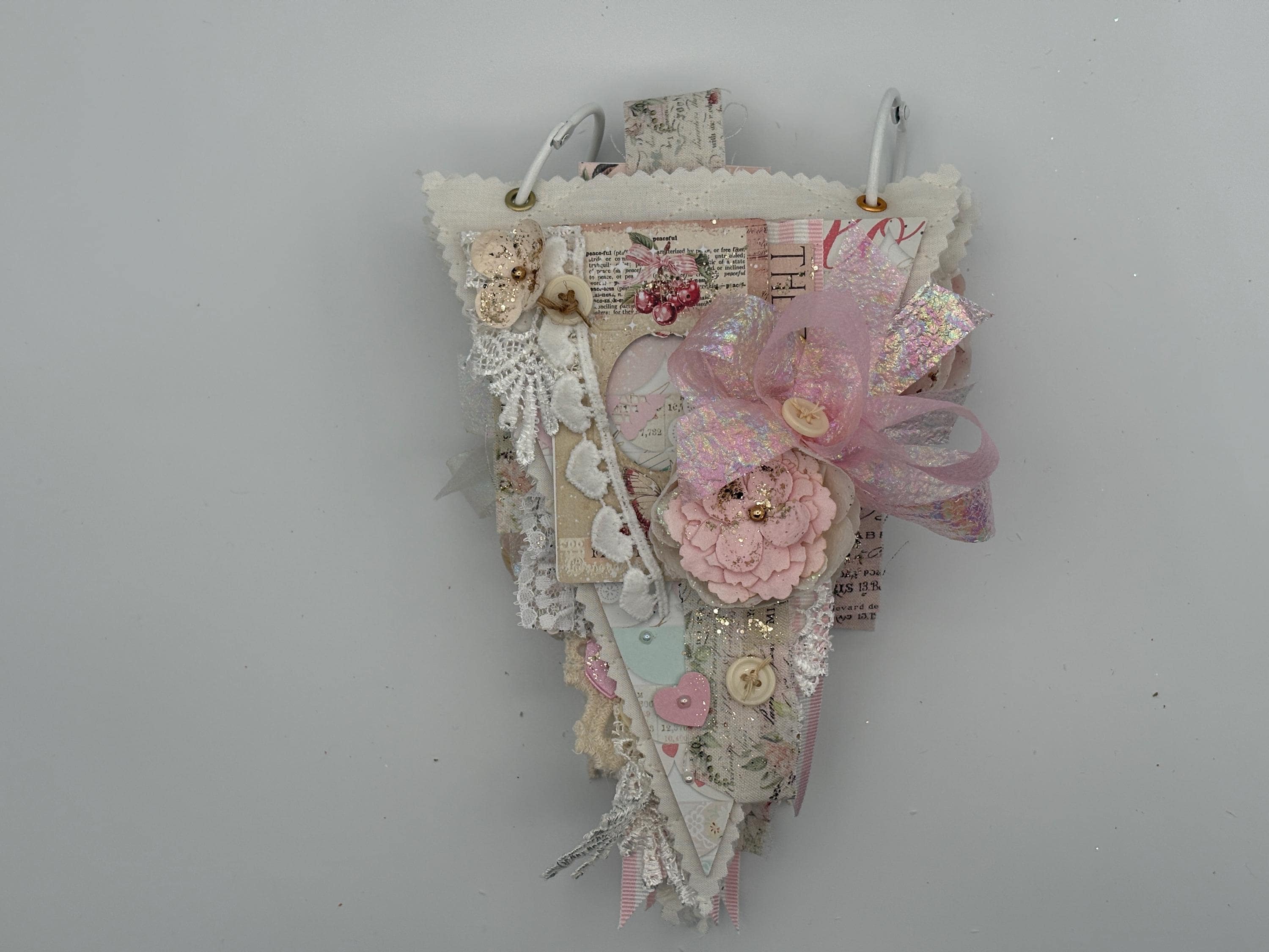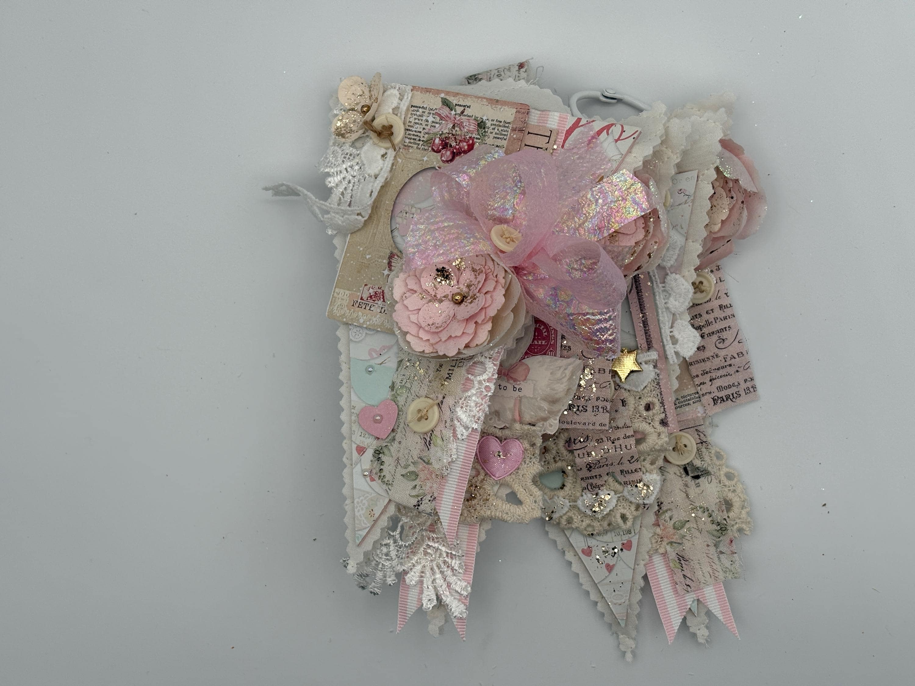 Decorated with pattern paper, ephemera, flowers, ribbon, lace, buttons gems, and gold glitter paste