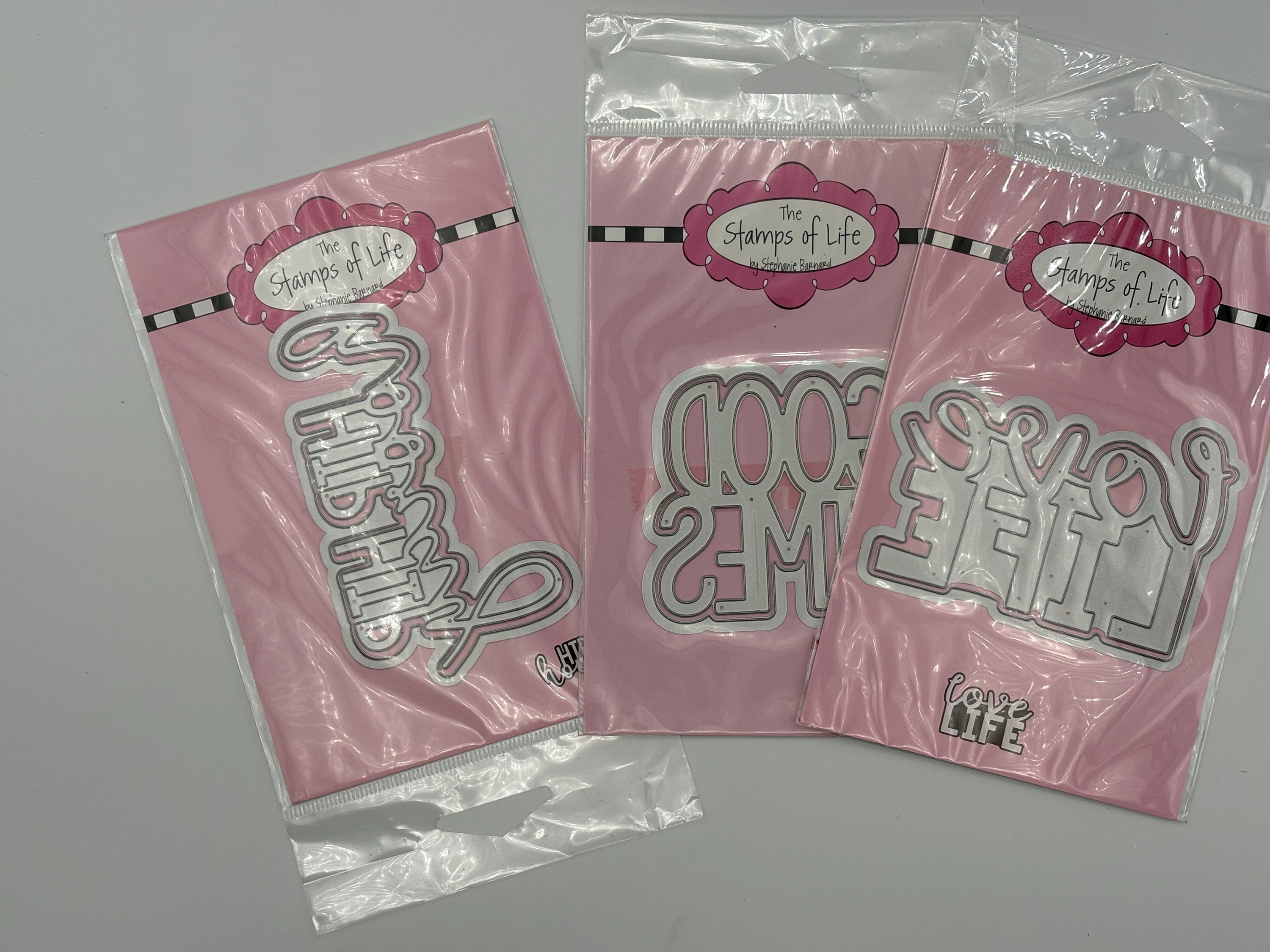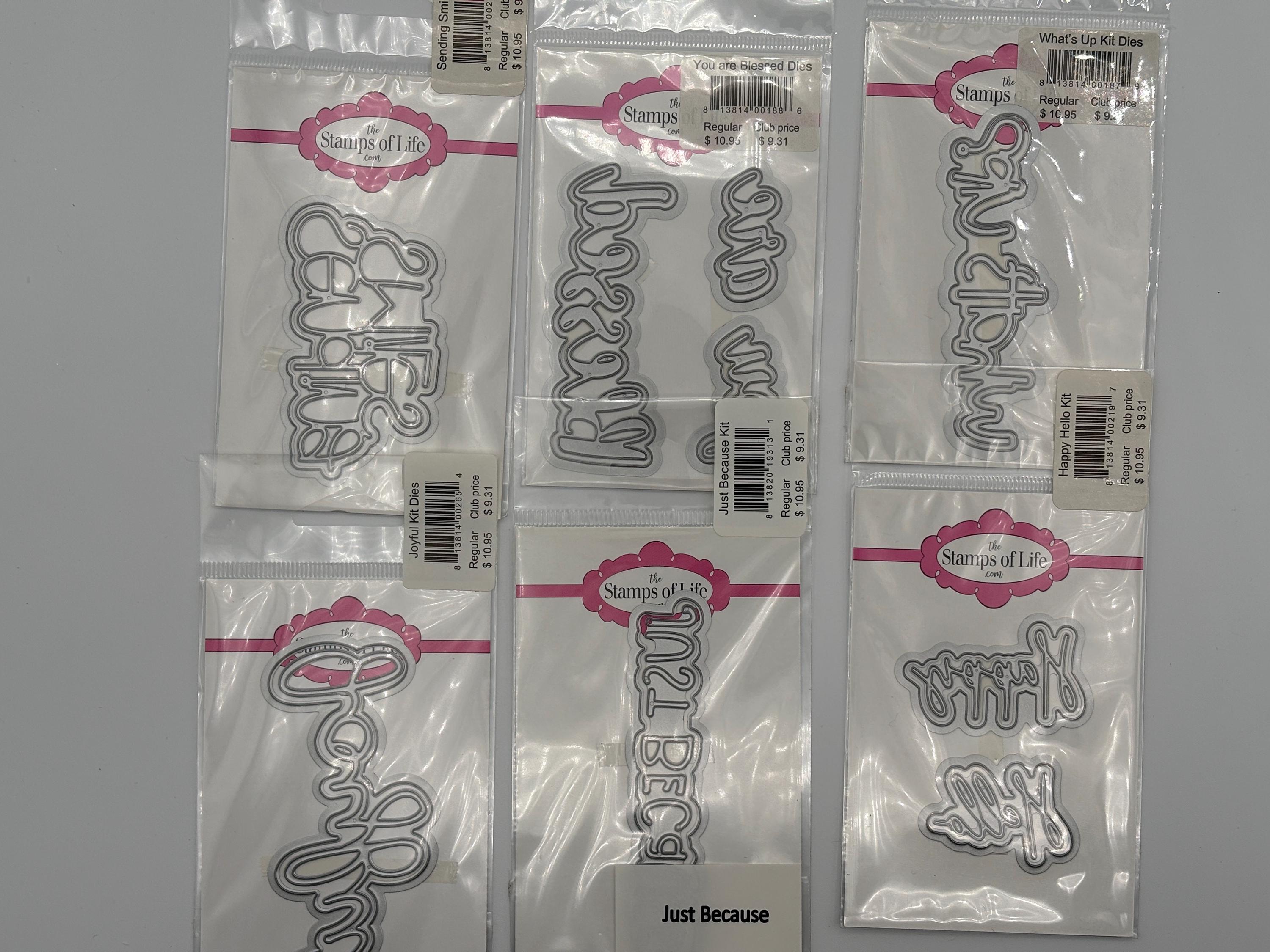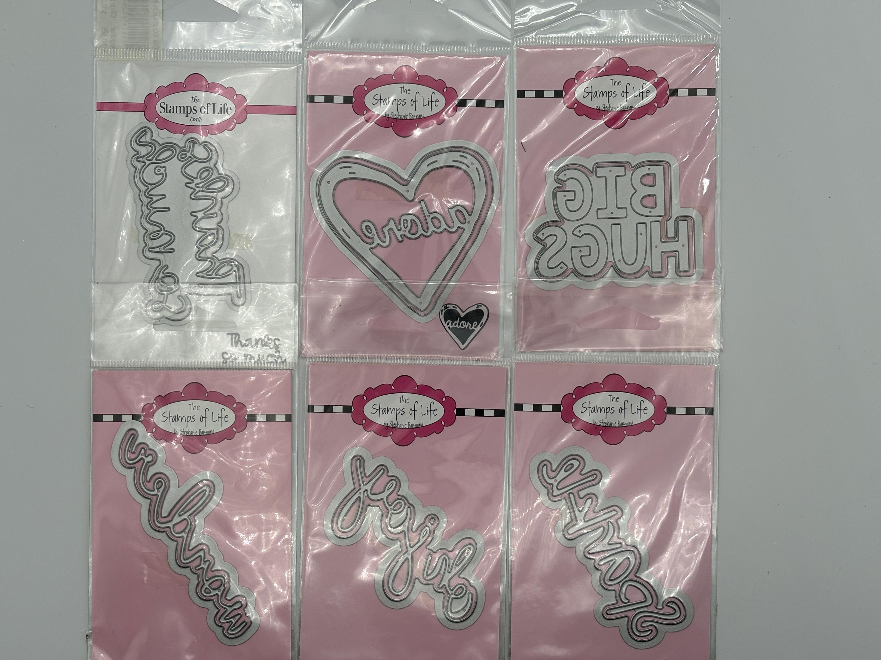 These dies have never been used and were sold by The Stamps of Life. This listing includes 38 sets of words/objects; Thanks so much, wonder, enjoy, adore, big hugs, sparkle (2), XOXO, incredible, flourish, shine, special friend, best wishes, love you, hey friend, cloud, balloon, jingle & jangle, woo hoo, Yay, awesome, leaf, what's up, you are blessed, sending smiles, joyful, just because, happy hello, enjoy, double hearts, dream, best day, grateful, amazing, great day, good life, good times, hip hip hooray