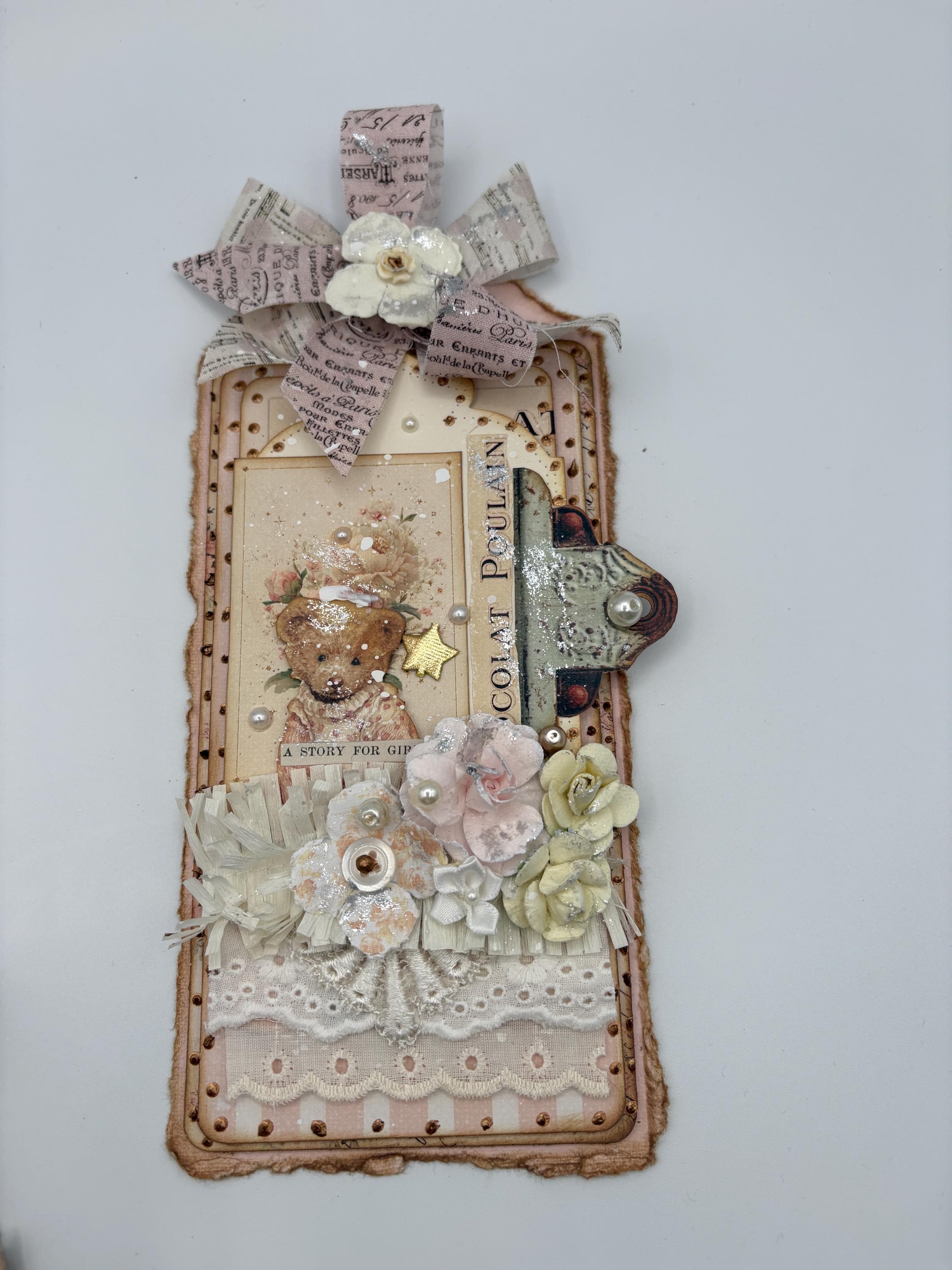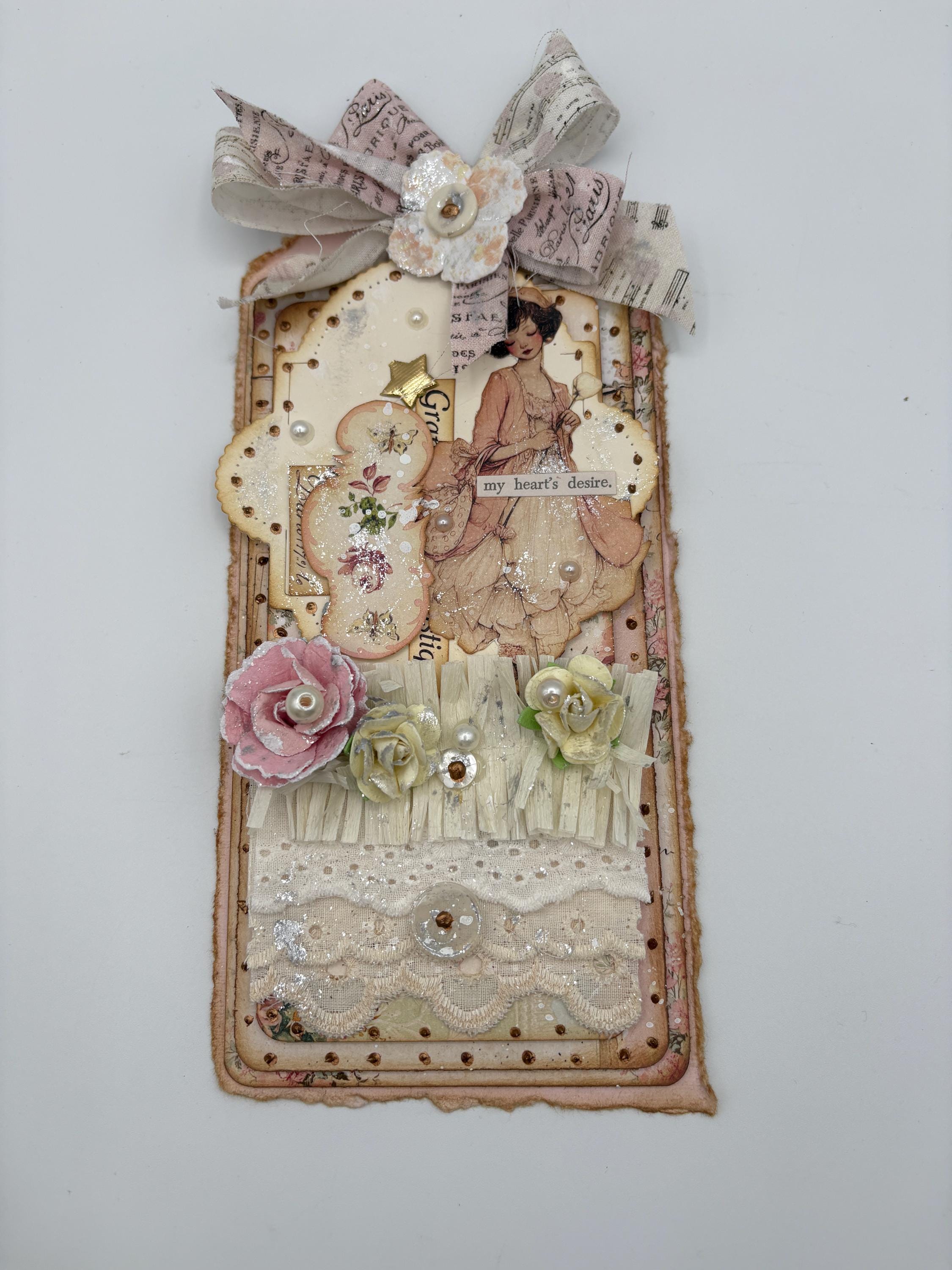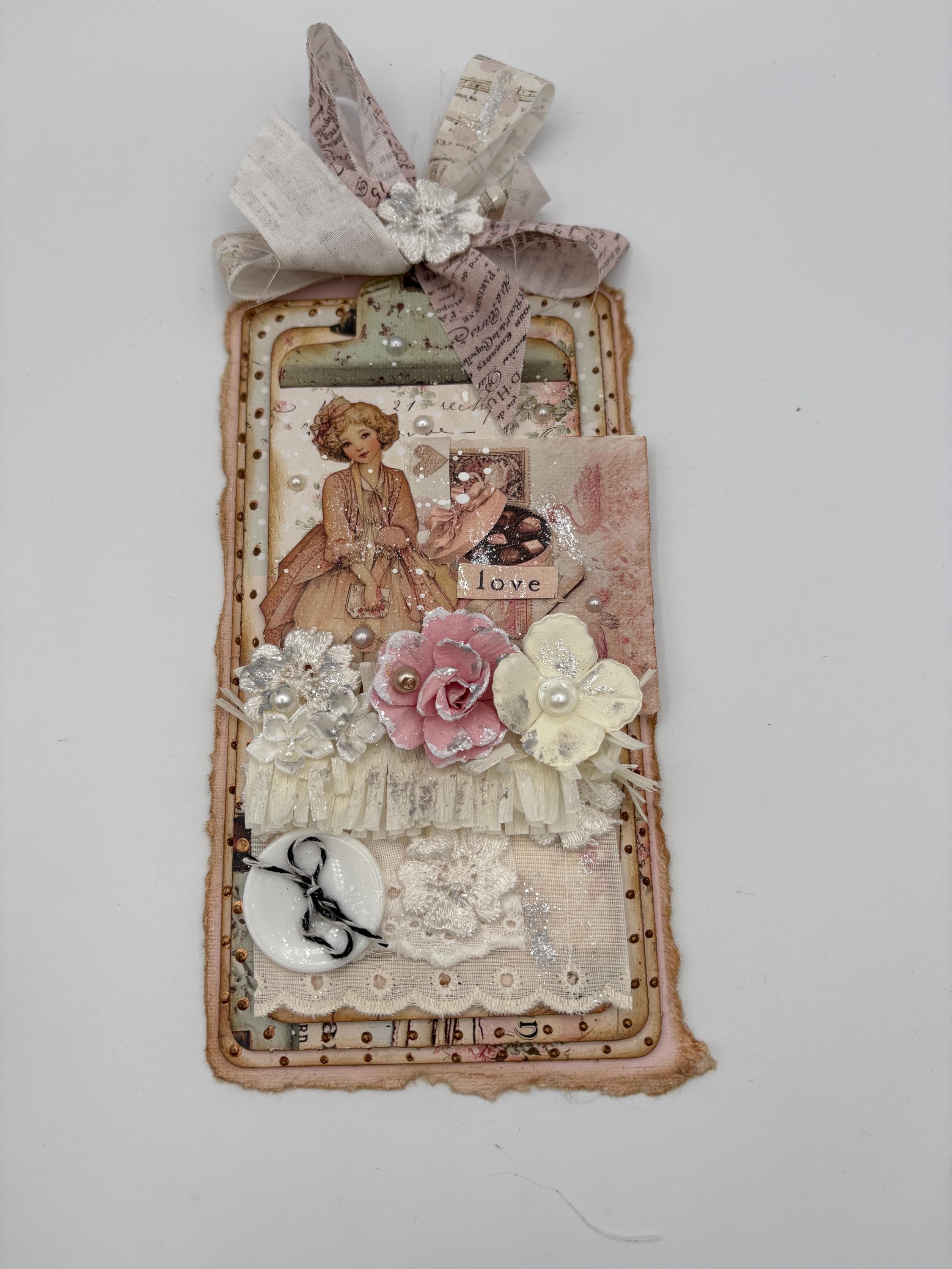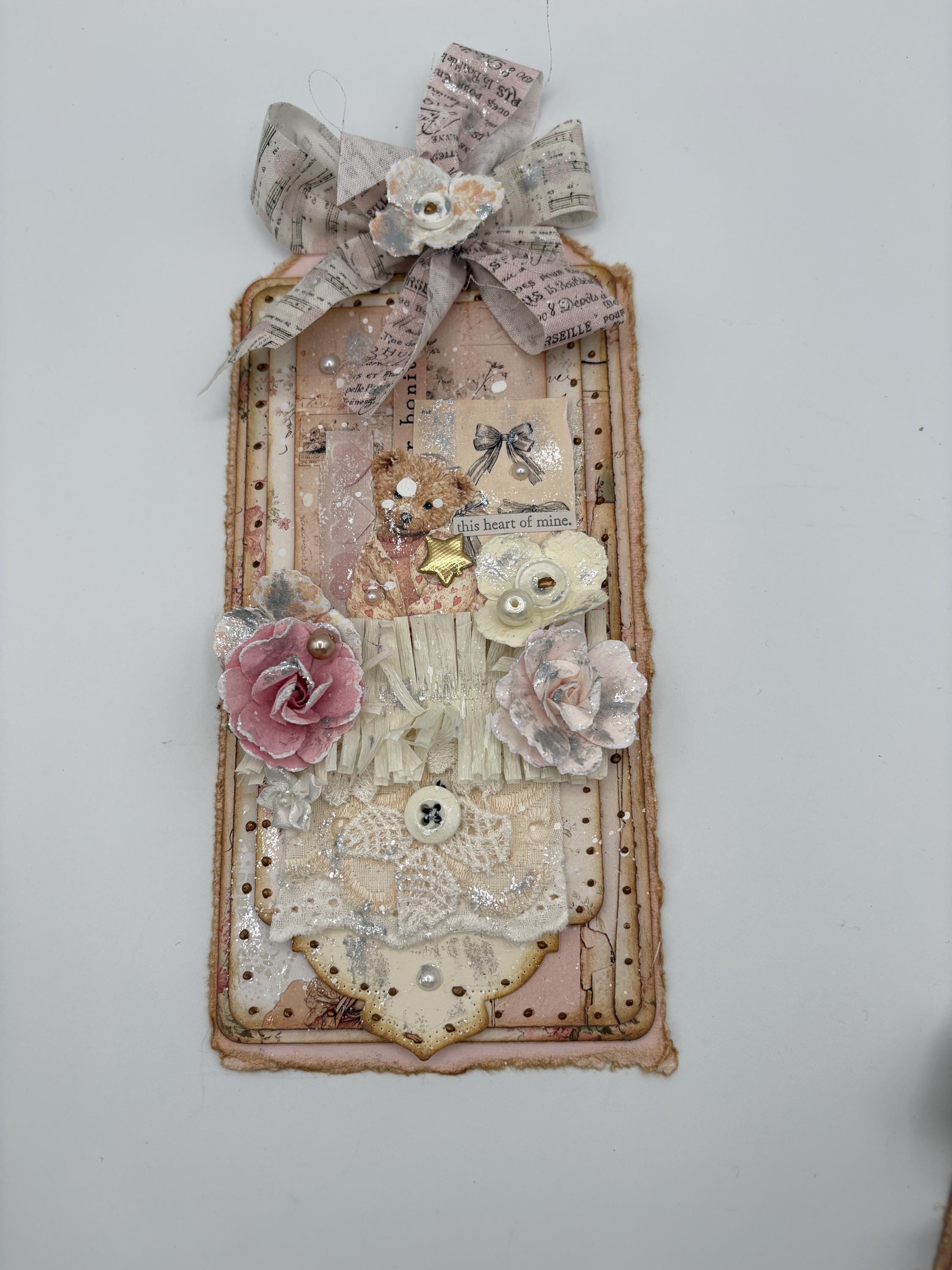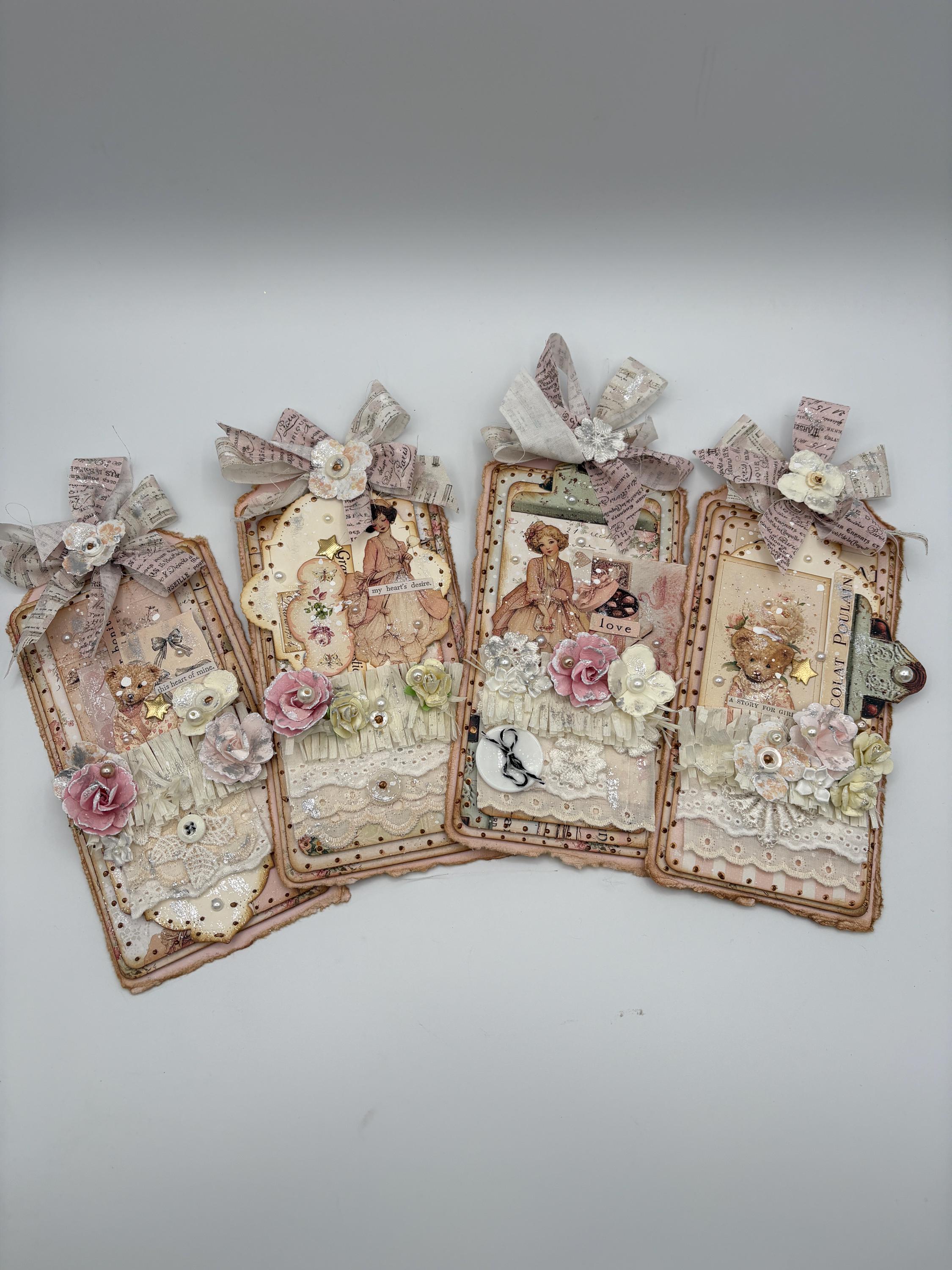 Decorated with ephemera, laces, fringe, flowers, buttons, pearls, and silver glitter paste. Each is splattered with white paint and finished off with dots of antique gold pearl drops